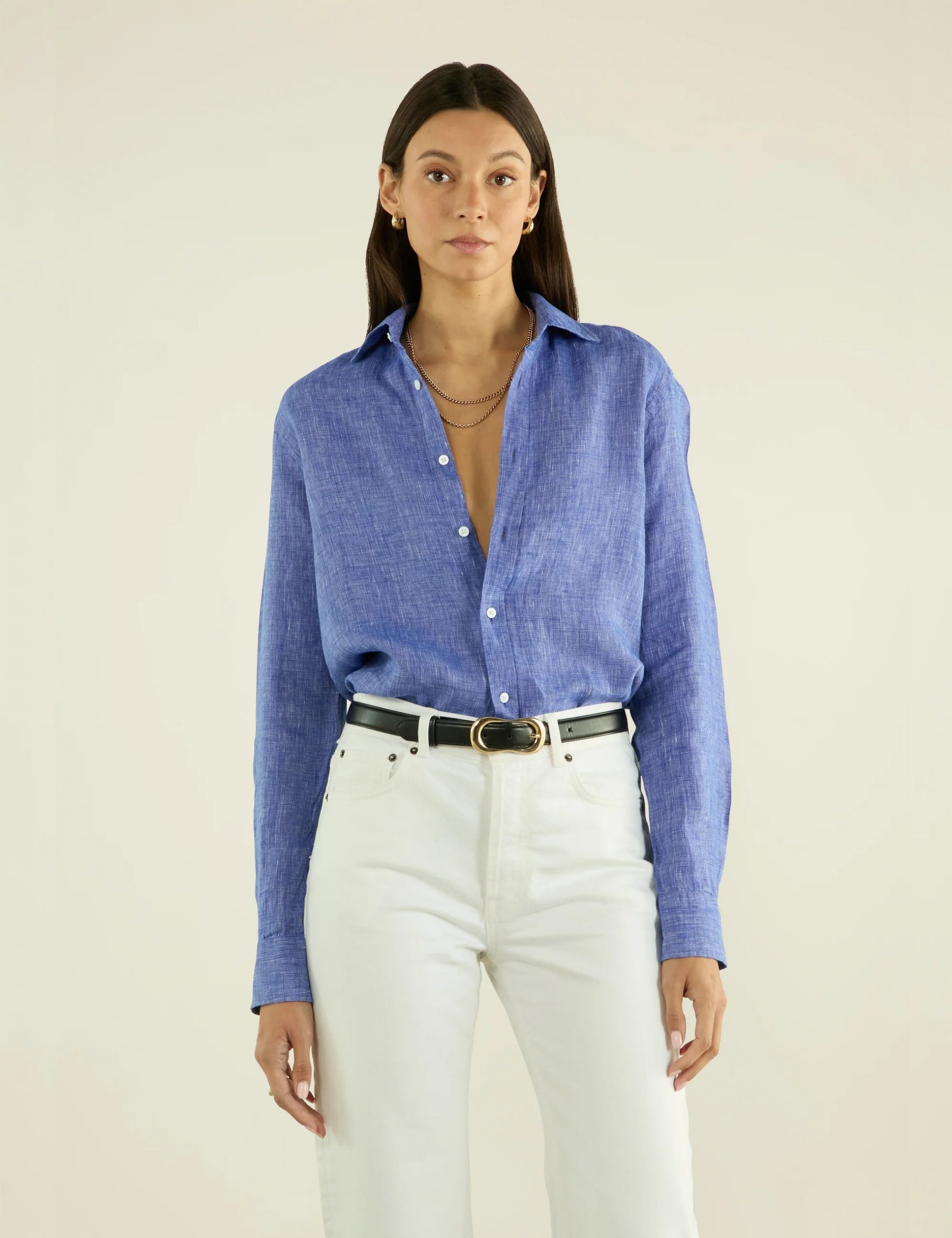 The Boyfriend: Linen, Lapis Blue in 100% Linen. This cool-toned shirt offers complete comfort. A timeless piece that effortlessly captures the spirit of warm spring and hot summer and drapes effortlessly over a bikini in the summer or tucked into jeans.